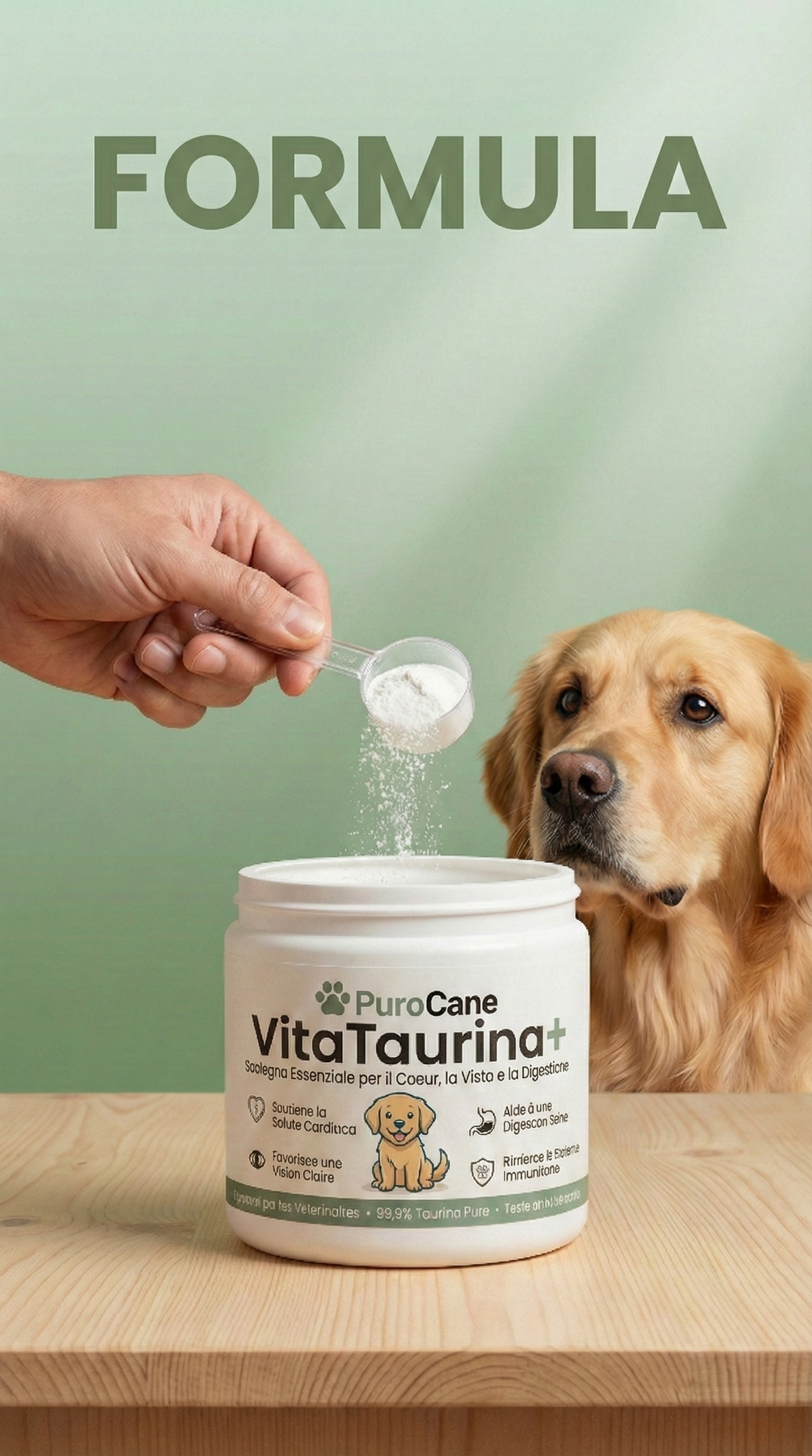 Un semplice cucchiaino di VitaTaurina+, mescolato al cibo del tuo cane, apporta la taurina essenziale che il suo organismo non può produrre autonomamente.