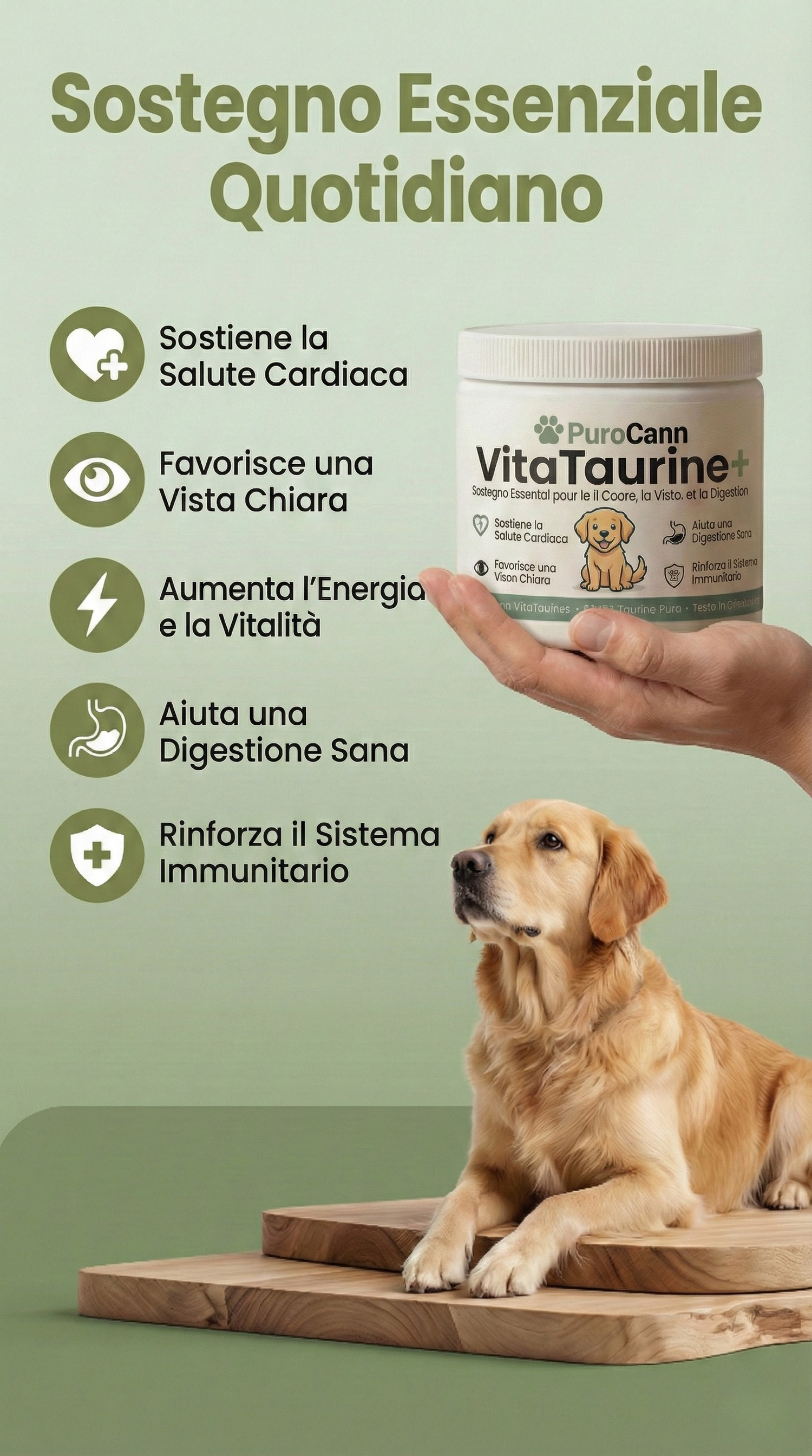 Anche se non noti cambiamenti significativi nel tuo cane, le carenze di taurina possono impiegare mesi a manifestarsi. Integrare fin da ora permette di agire d'anticipo, prevenendo l’insorgere di squilibri più gravi.