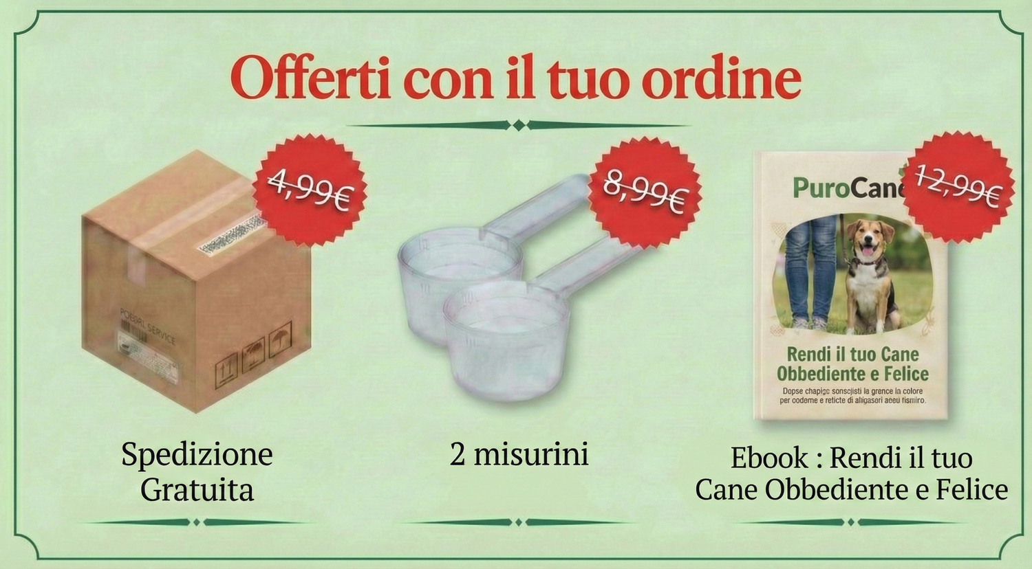 Prova PuroCane per 30 giorni, senza alcun rischio. Se non noti un miglioramento nell'energia e nel benessere del tuo cane, ti rimborseremo l'intero importo. Senza dover dare spiegazioni.